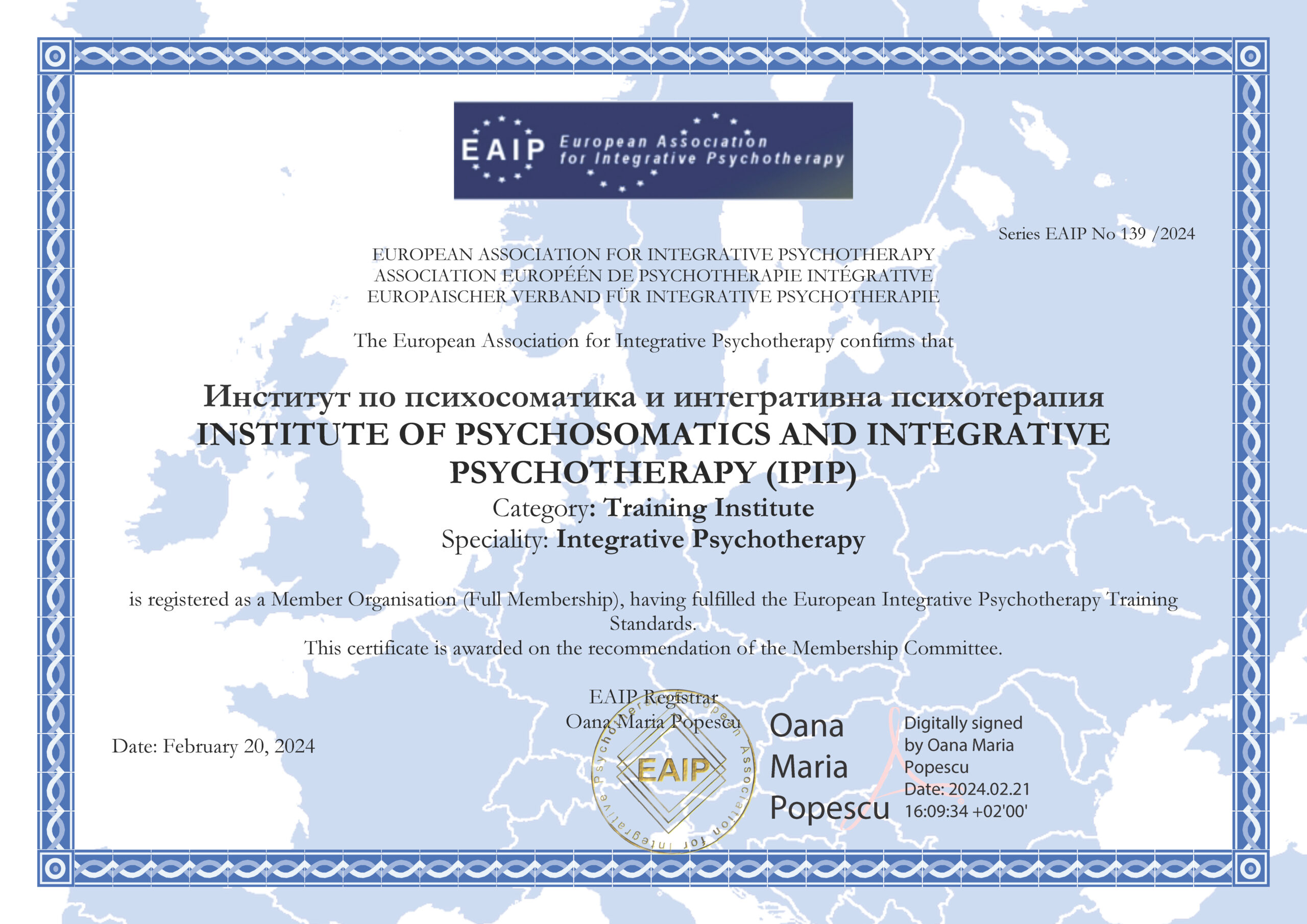 Благодарим за Вашия интерес към “Институт по психосоматика и интегративна психотерапия”, който е първия по рода си в България. Института е пълноправен, акредитиран член на Европейската Асоциация по Интегративна Психотерапия (EAIP). За първи път психолози, психотерапевти и завършили хуманирани науки ще се обучават в интеграция на псохотерапевтичните методи, както и в психосоматични направления. Бихме се радвали, ако успеем да отговорим на всички ваши въпроси за обучението.